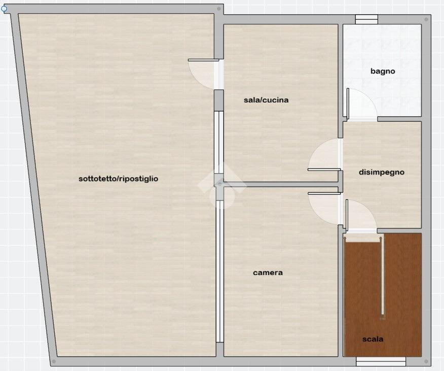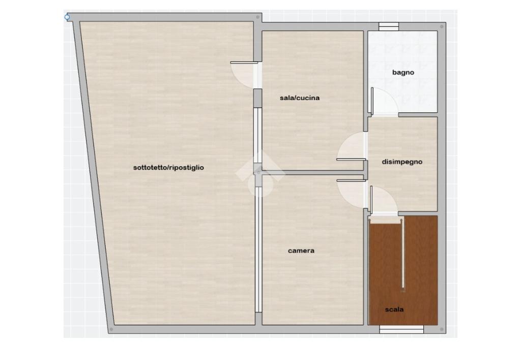 Al secondo piano troviamo la mansarda di 60 mq. Il disimpegno all'ingresso separa tutti gli ambienti dell'immobile dove troviamo il soggiorno con cucina a vista, camera da letto e bagno finestrato, oltre ad un grande ripostiglio nel sottotetto.